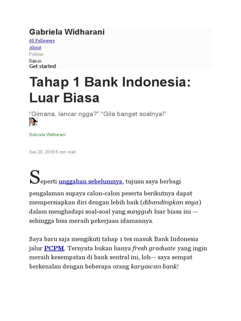 Luar biasa | by gabriela widharani | medium pengalaman rekrutmen pegawai setingkat staff posisi kasir di. Kali ini gua mau cerita mengenai rekrutmen bank indonesia yaitu program rekrutmen pcpm bi 32. Berikut kiat sukses berdasarkan pengalaman #tk! Harap diperhatikan bahwa kiat sukses ini tidak menjamin pembaca pasti diterima! Untuk contoh soal cpns beserta tips super lulus tes cpns 2019 selengkapnya dapat anda lihat di tips super lulus tes cpns 2019, contoh soal, kunci jawaban serta pembahasannya.