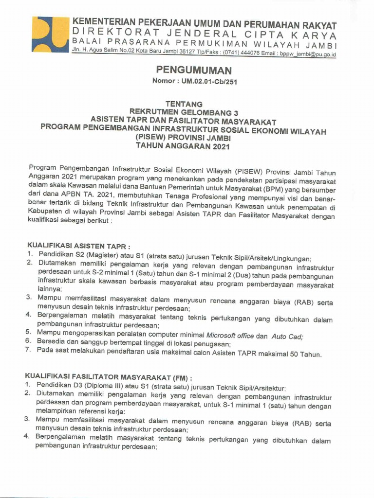 Ditjen Cipta Karya from ciptakarya.pu.go.id Namun apakah itu jaminan bahwa tanggung jawab kewajibannya pasti dilaksankan dengan baik??sekali lagi jawabannya dalah tidak! Sehubungan dengan pelaksanaan program pengembangan infrastruktur sosial ekonomi wilayah (pisew) ta 2021, balai prasarana permukiman wilayah(bppw) kalimantan barat satuan kerja pelaksanaan prasarana permukiman membuka lowongan tenaga fasilitator masyarakat(fm). May 11, 2019 · mundurnya tenaga pendamping itu disinyalir karena gaji terlalu kecil. Apalagi mereka harus melayani antara 2 hingga empat desa per orang. Pendampingan yang diberikan antara lain berupa bimbingan teknis dan manajemen sesuaipedoman, pendampingan proses tiap tahapan pelaksanaan, serta berkoordinasi dengan seluruh stakeholder di kecamatan, kabupaten dan. Nov 09, 2011 · misalnya dari masalah gaji fasilitator p2kp saat ini tercatat fasilitator pemberdayaan termiskin jika dibandingkan dengan program pemberdayaan masyarakat lainnya (pnpm pisew, pnpm mpedesaan,dll). Feb 23, 2021 · lowongan kerja pisew ditjen cipta karya tahun 2021. Kemudian mungkin terkait dengan salari, gajinya sekitar 4 juta tambah biaya operasional 500 ribu total rp.4,5 juta.